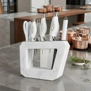 Ergonomik tasarımı sayesinde uzun süreli kullanımlarda bile elinizi yormaz, güvenli bir kesim deneyimi sunar. Şık bıçak bloğu, mutfağınıza estetik bir dokunuş katar.